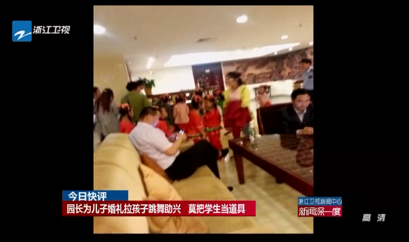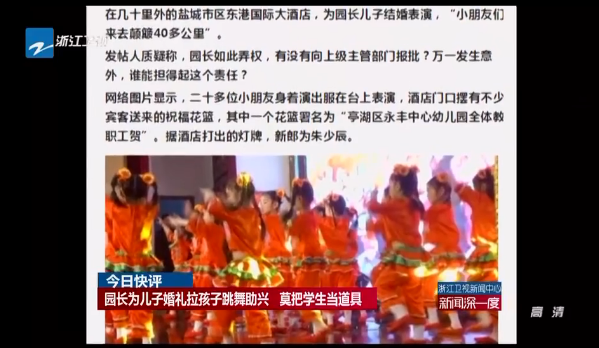 5月13日,江苏盐城多个网络论坛和本地资讯类微博曝出,盐城市亭湖区永丰镇永丰中心幼儿园的不少孩子,于12日晚上被幼儿园组织、集体拉到几十公里之外的市内某大酒店,目的为该幼儿园园长儿子的婚礼现场跳舞助兴。