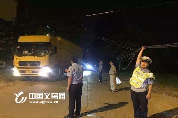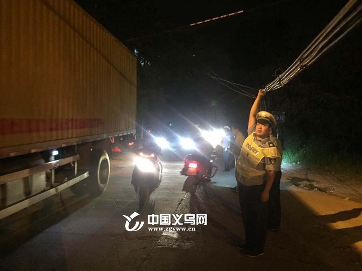 “晚上经过廿三里后乐村,看见一辆大车刮到电缆线,当时好奇拍了一张就走了。约半小时后回去看见一胖胖的交警小哥用手托着电缆线,提醒经过的车辆。为交警小哥觉得辛苦,这种正能量也是要多宣传宣传。”6月6日晚上,网友“王怜花”在义乌某论坛上发了一则帖子。从帖子图片中可以看到,一名身穿反光背心的交警正站在路中间,高举双手,托着上方的电缆线,还不断有车子从电缆下方经过。